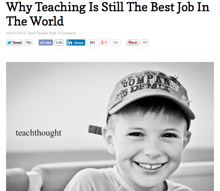 Why Teaching is the Best Job in the World April 9, 2015 paulgmoss Uncategorized Leave a comment 7 reasons why teaching remains my calling. Share this: Share on X (Opens in new window) X Share on Facebook (Opens in new window) Facebook Share on LinkedIn (Opens in new window) LinkedIn Share on Tumblr (Opens in new window) Tumblr Like Loading... Related