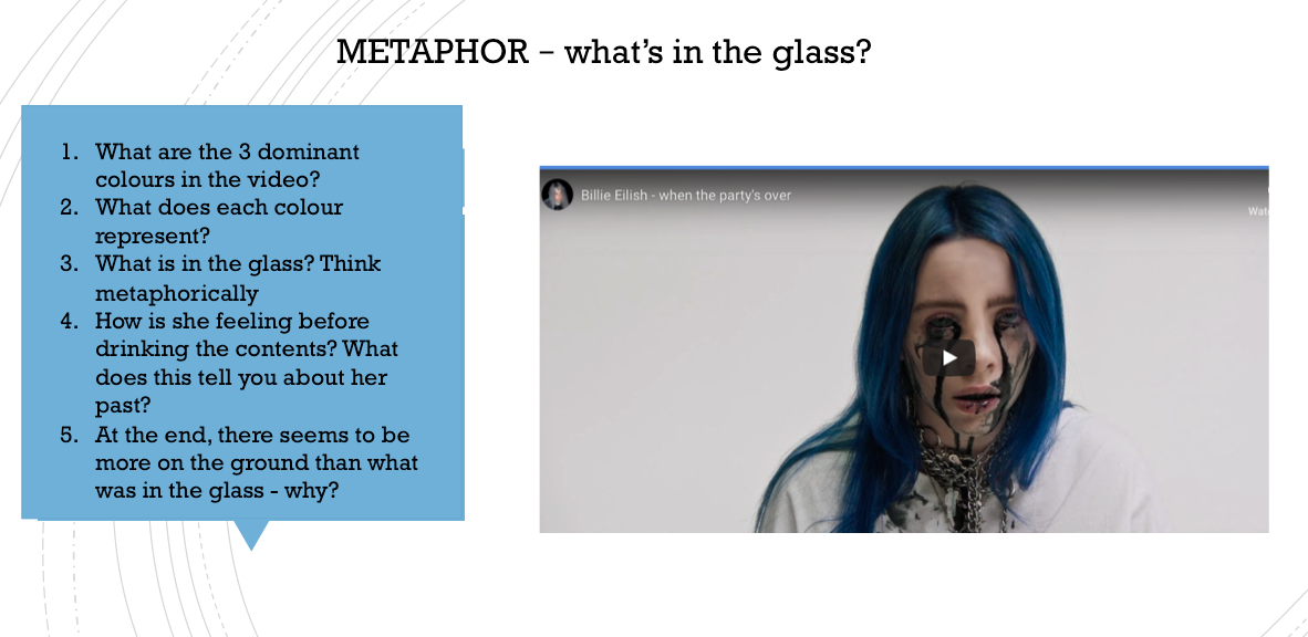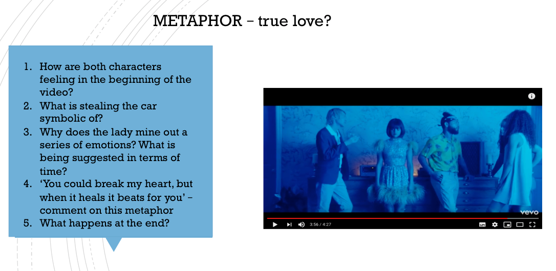 Image often relies on metaphor to communicate. An image will use a certain subject/colour/frame/ to represent or symbolise something else, and like the written word, it is effective because it opens up the reader’s thinking. The concept of metaphor is of course key to the English syllabus, driving the majority of texts, and allowing artists to describe, challenge, and celebrate the world around us. However, understanding metaphor can be a difficult thing for many students as it moves thinking into the abstract. Music videos can offer the chance to engage students with metaphor by modelling and explaining how meaning is made from what is presented visually. We know that skills are rarely transferable, but I believe that an understanding of visual metaphor significantly helps students understand the concept of metaphor, which they can then more easily engage with when in written form. Many of the metaphors used in video can just as easily be used in a written form.
