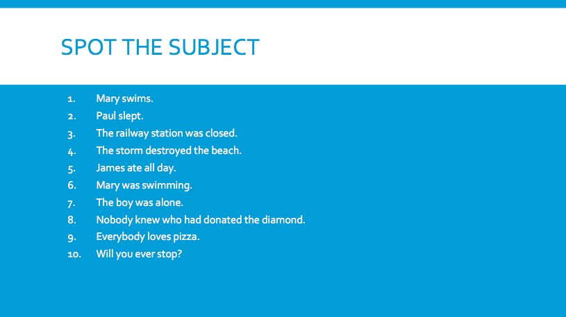 - SUBJECTS – Everything starts with the subject – without a subject there is no life. Subjects are nouns of course, and it is useful here to recap the most used types of nouns: common, pro, abstract, proper, collective. The first task then is to gradually build the ability to identify a subject. Begin with only 2 words in a phrase or clause (subject and verb), and keep adding words to the phrases or clauses or full sentences to increase the difficulty. Importantly, repeat this until the student understands it – that is, isn’t simply guessing. This may mean you add multiple slides to the ppt, providing a new activity each day. The final activity to ensure students understand what a subject is, is to have them design their own examples, as though teaching another student.