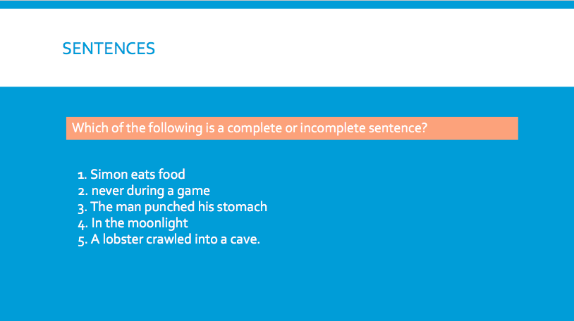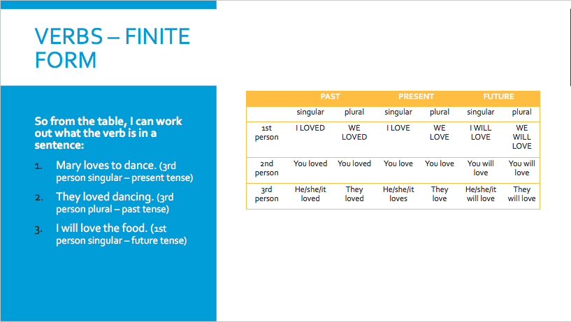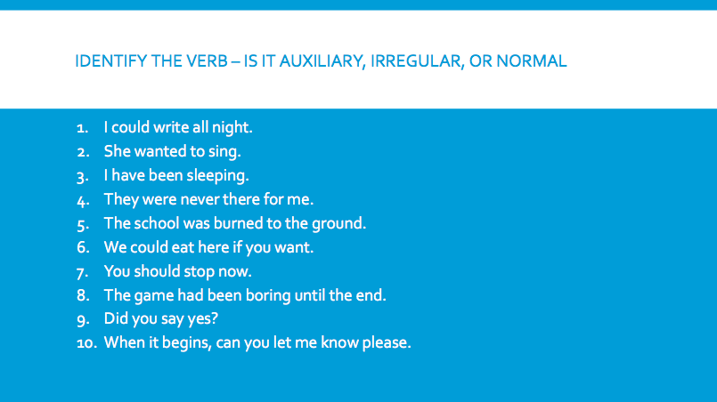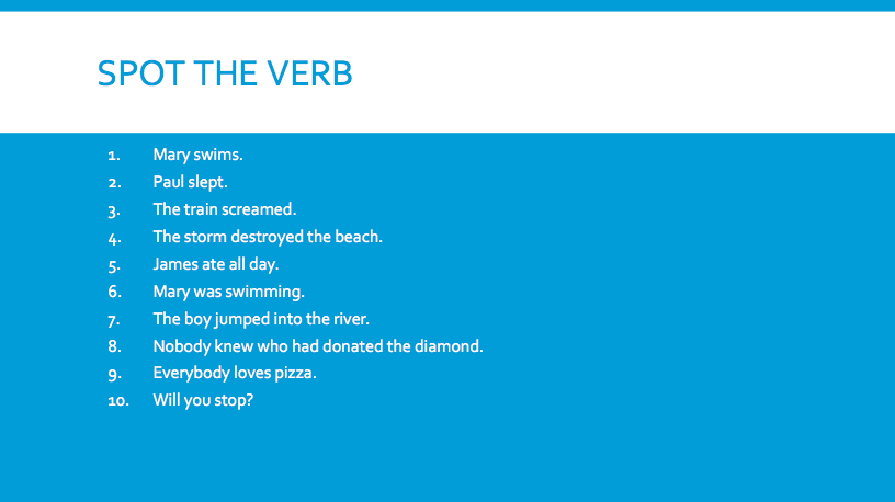 2. VERBS – In order for life to make any sense, subjects need to do things. These actions, movements, or states are verbs. Begin by providing verbs that are quite simple to detect, which means avoiding the verb to ‘be’ at this stage. Verb forms will be looked at next, so at this stage, very simple clauses and phrases with barely any conjugating (most will know what the past, resent and future is, so you will be able to have some conjugation), and certainly no modal or verb to ‘be’ should form the examples of deciding what’s a verb. Importantly, repeat this until the student understands it – that is, isn’t simply guessing. This may mean you add multiple slides to the ppt, providing a new activity each day.