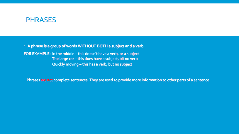 4. PHRASES – defining what a phrase is: a group of 2 or more words that add extra information to a sentence. This means that a phrase doesn’t have to contain a subject or a verb, but often contains at least one of them. Because phrases add more information in sentences, there are various examples of phrases that match other grammatical terms: noun phrase, adjectival phrase, verb phrase, adverbial phrase, prepositional phrase etc. Most importantly, a phrase CANNOT exist on its own as a sentence, and spotting them is important for understanding what a sentence is. Understanding this idea should be consolidated before moving on, and this can be achieved via activities with lots of examples of phrases. This activity also restrengthens the understanding of nouns and verbs, and can be an introduction to prepositions and adverbs, as they are both common types of phrases (not essential to do this however).