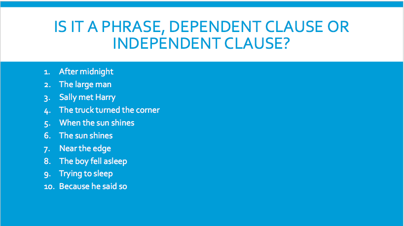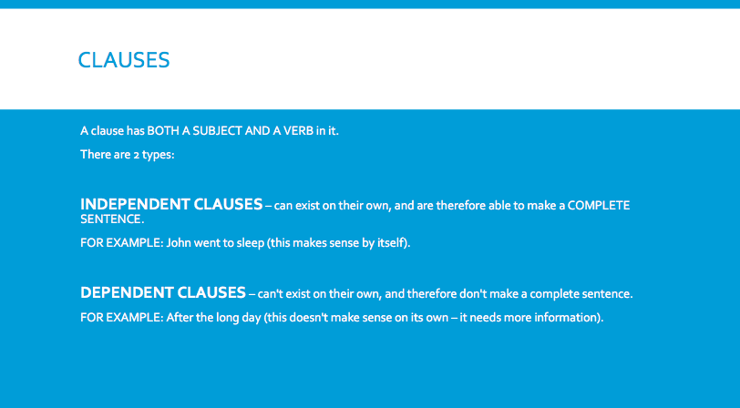 5. CLAUSES – clauses do contain BOTH a subject and a verb, and so are the closest thing to comprising a complete sentence, and therefore requiring punctuation. But there are two types, with only one actually being a complete sentence: the independent clause. Students therefore really need to understand the difference between independent clauses and dependent clauses. Fortunately, the names make it easier to decipher their purposes. Students should also be introduced to the different connectives that turn independent clauses into dependent clauses at this stage.