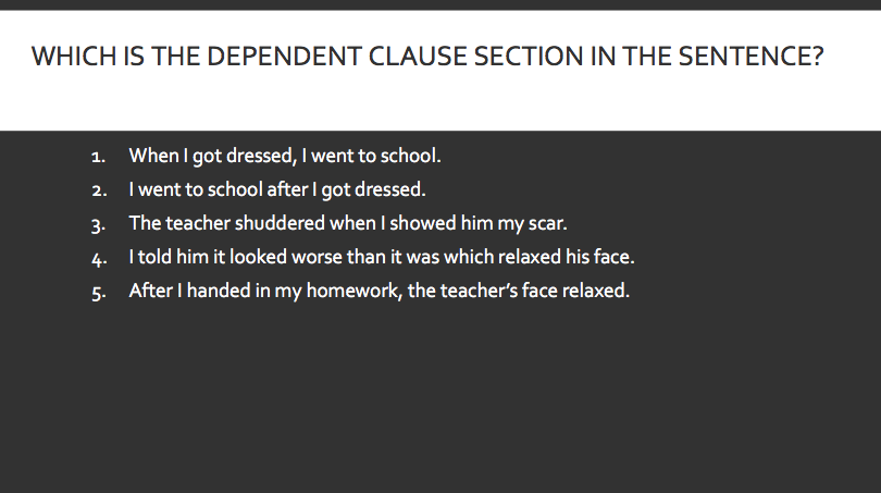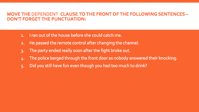 FRAGMENTS – students with poor sentence construction knowledge often write fragments, which is essentially writing a dependent clause and believing it to be an independent clause. Taking time at this stage to provide examples of fragments is important here, so students can see them in action, but be explicitly guided through the fact they are actually dependent clauses, and therefore cannot be real sentences.