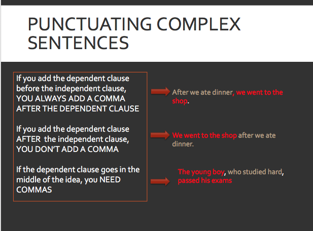 7. COMPLEX SENTENCES – are sentences that contain a mixture of independent clauses and dependent clauses. Where the dependent clause comes in the sentence determines if a comma is used to separate them. Activities should focus on: determining which part of the sentence contains the dependent and which the independent clauses; whether the comma is needed depending on the position of the clauses; to finally, is the complex sentence punctuated correctly.