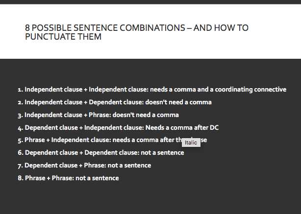 The final activity would be to focus on punctuating sentences that add a phrase to an independent clause. This then essentially covers all the possible punctuation scenarios as indicated in the image below.