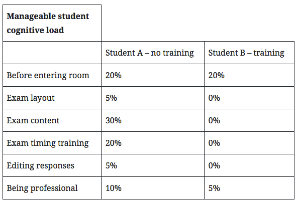 As you can see by the very much made up numbers, the cognitive load experienced by Student A is significantly greater than Student B, and would indubitably affect performance in the exam. The student’s knowledge would have to fight a great deal to break through the pressure.