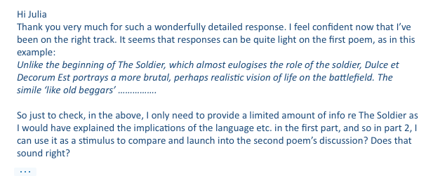So, with this in mind, I have been instructing my students to very much focus more of their discussions on the second text, using the expression ‘as previously discussed’ to refer back to analysis explanations of the first text in the response, as can be seen in this developmental model here, and in a real comparison of To Autumn with Excerpt from The Prelude here. This significantly allows for more discussion on the 2nd poem. A strategy to help revise for what poems would be worth revising assiduously is here.