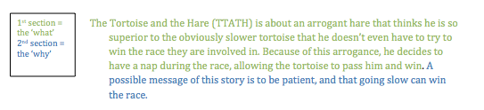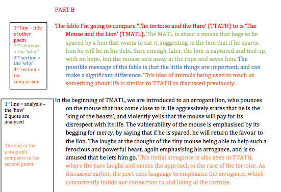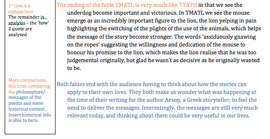 Originally, I would make the writing tasks open book, with notes available to reduce the cognitive load of having to think about the content as well as the structures required too respond. But I’ve begun to think that the cognitive load is still going to be high as students have only just been exposed to what are very complex texts. For this reason, I’ve begun to teach writing structure for comparative responses using texts that are simplistic in nature. A simple text type is the Aesop fable. The stories are perfect in that they are really well known (and if not, quickly and easily understood), and have very explicit sections that correlate to the way I want my students to respond. The fables have a clear storyline (the WHAT), a clear message (the WHY – strongly linked to context), and use precise language techniques (the HOW) to deliver the story and message. - The next stage would be to provide a template, a structure with which students can respond. Students are given guidance on how to sequence a response to the first text. The actual analysis (the HOW) is not so important here, but more so the design of response.
