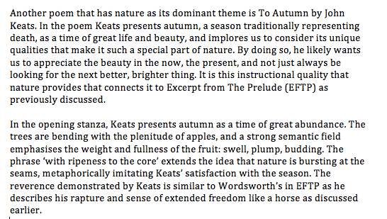 Presently, in the poetry lesson described at the beginning of this post, that would involve comparing two poems that have nature as a theme. The full example in comparing Excerpt from The Prelude with To Autumn is here.