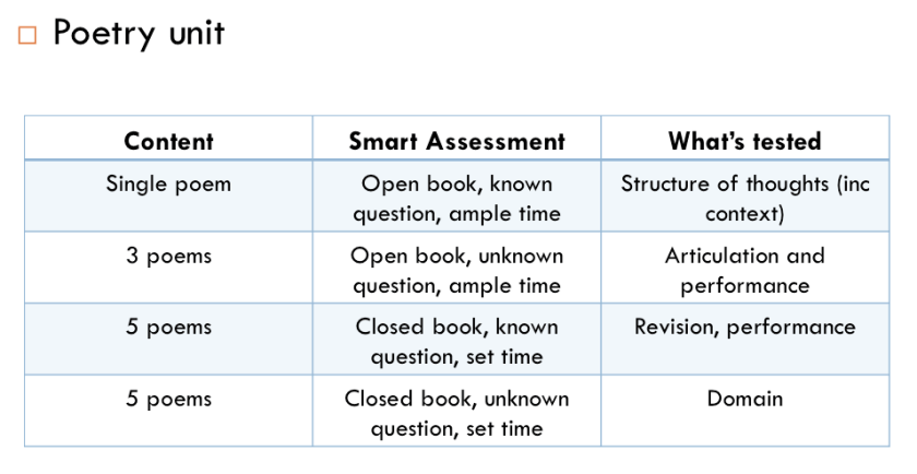 To begin, I would assess on a single poem, but have it open book with a known question, which will allow me to check for the way students are structuring their thoughts. I don’t make it closed book because if I do that, errors can stem from two sources: not just lack of structure knowledge, but also content knowledge too. I also don’t want to place time limits as performance could be a factor in poor responses. I would continue this piece of writing until I have a strong success rate, as moving on from here without security would be inhibitive to future success if many students still couldn’t master this stage.