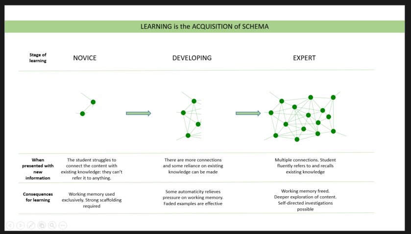 There is an enormous amount of research (Clark and Mayer 2008) validating the effectiveness of modelling your own thinking and processes to students to move them from novices with immature schemata to experts with developed, sophisticated schemata. The novice is indeed a different type of learner to the expert, their less developed schemata severely impacting the cognitive load on working memory, and thus having significant implications to the types of questions and activities you engage them in. The table below illustrates the need to understand the learning continuum when planning a sequence of learning.