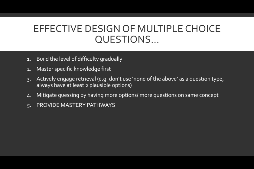 Of course, designing a multiple choice sequence is a time consuming affair. Sometimes coming up with the ‘wrong’ distractor options is actually quite difficult. Having to then design extra questions to satisfy a mastery pathway is even more demanding. But, once created, the multiple choice test is able to be used multiple times, over many years, and will have significant benefits to students who present with learning gaps. Also, it will actually save you time in the long run as less energy will have to be spent addressing gaps further into a course.