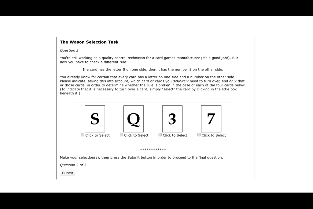The third requisite is the design of the exam questions. A strong design would have to ensure that the expected transfer of knowledge is not too ‘far’, and in fact is closer to ‘near’ transfer. We often exult in education’s aspiration of being able to transfer knowledge into new contexts, but the actual reality of this may render us less optimistic. The Wason experiments illustrate this well, suggesting that our knowledge is really quite specific, and that what we know about problem solving in one topic is not necessarily transferable to others. If you don’t believe me, try this experiment below, and click on the link above to see the answers.