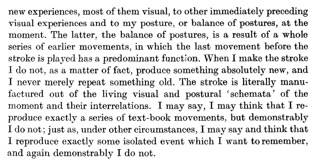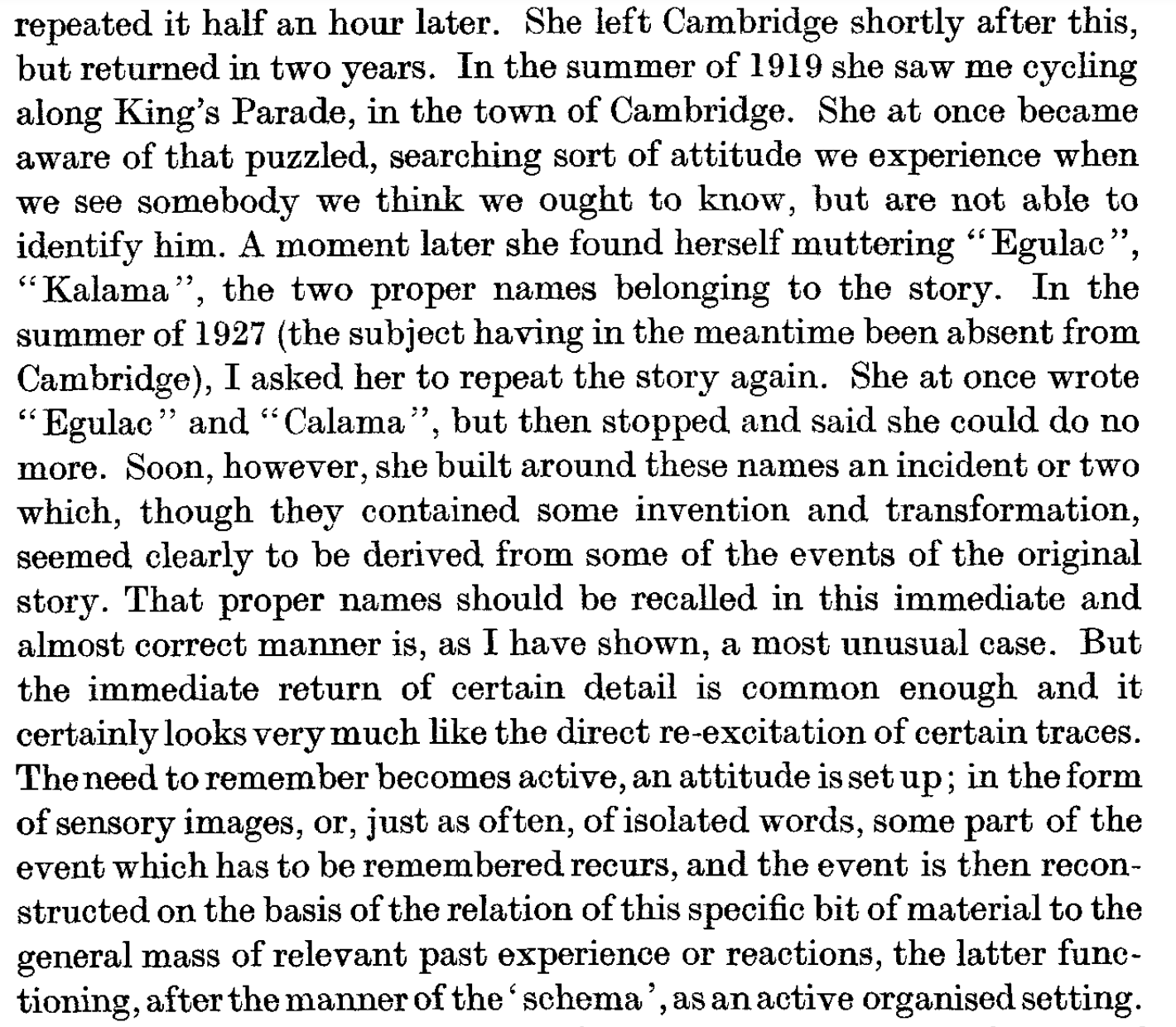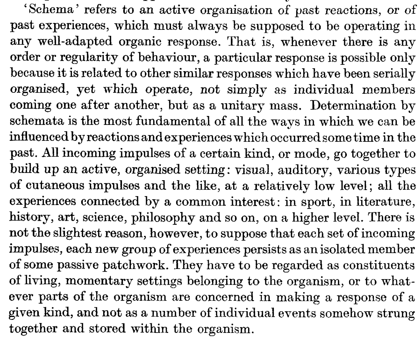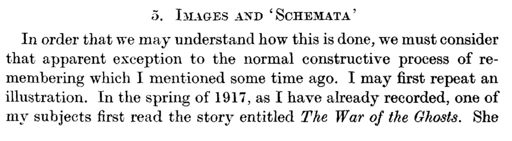 F C Bartlett is considered to be the father of schema theory. The screenshots below are captured from his 1932 seminal work: Remembering. here.