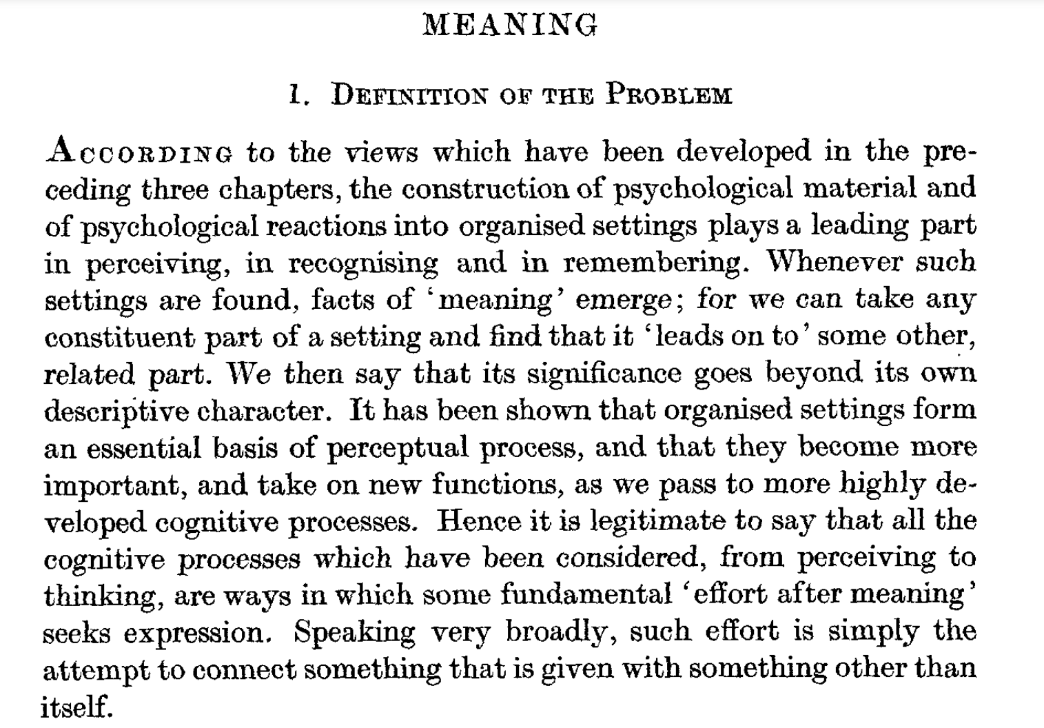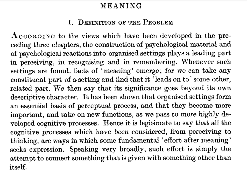 Bartlett undertakes a series of experiments that lead him to create a theory of remembering. He discusses some interesting ideas about what he believes consciousness to be, and very much believes learning is an active construction of what we see before us and what has already happened.