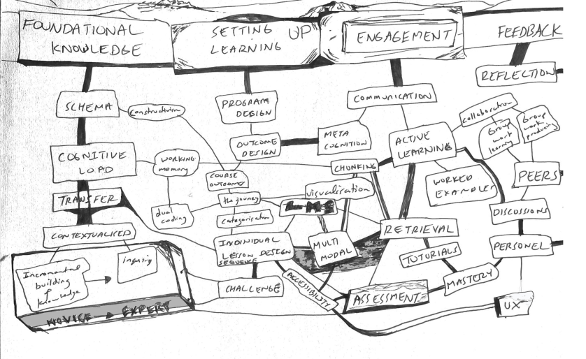 A way to avoid the curse then is to write down what the outcome of the learning is, and then work backwards articulating all of the knowledge that is needed to satisfy it. This will lead to the creation of sub-outcomes, and what knowledge is needed for their achievement can also be written down. Making this a visual thing, or mind mapping the course is an effective approach to do this as it forces you to make the connections between the knowledge you are going to teach. Such an approach will almost inevitably make you realise that you had forgotten something that needs to be mentioned or taught. An example of such a map is below. When I began to add the elements I knew were important to achieving the course learning outcomes, I began to draw lines to certain knowledge – this allowed me to then consider how I would draw attention to the connections in a lecture. I discuss the pedagogy behind creating a visual map of your curriculum here.