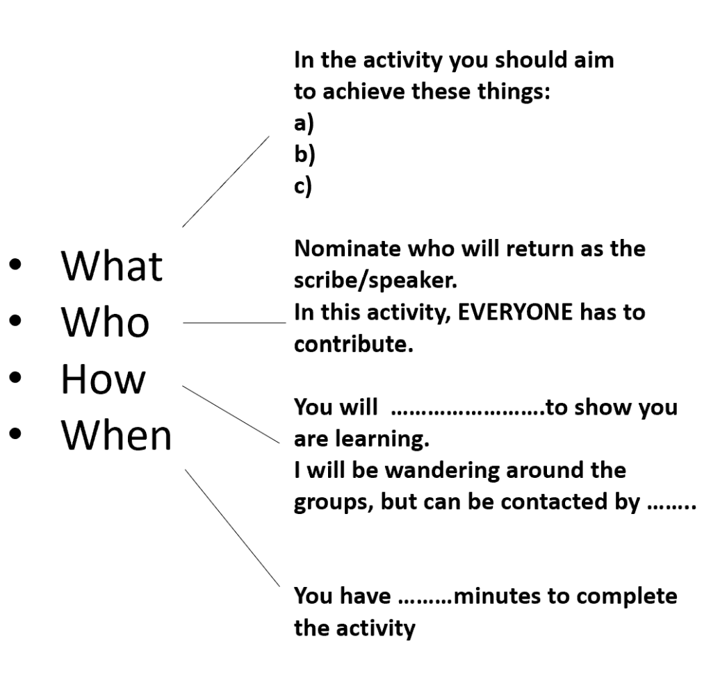 I use the template of What, Who, How and When to detail the instructions. Of particular note is the need to inform students of the expectations for participation (i.e. everyone) and how they will demonstrate this. Is it going to be a shared doc, or shared verbal explanations?
