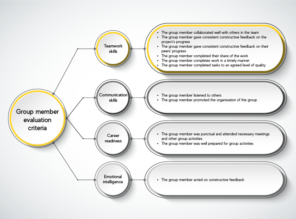 The selection of criteria for a group member evaluation (GME) rubric is likely to be motivated by the graduate attributes of teamwork, communication, career readiness, and self-awareness /emotional intelligence.