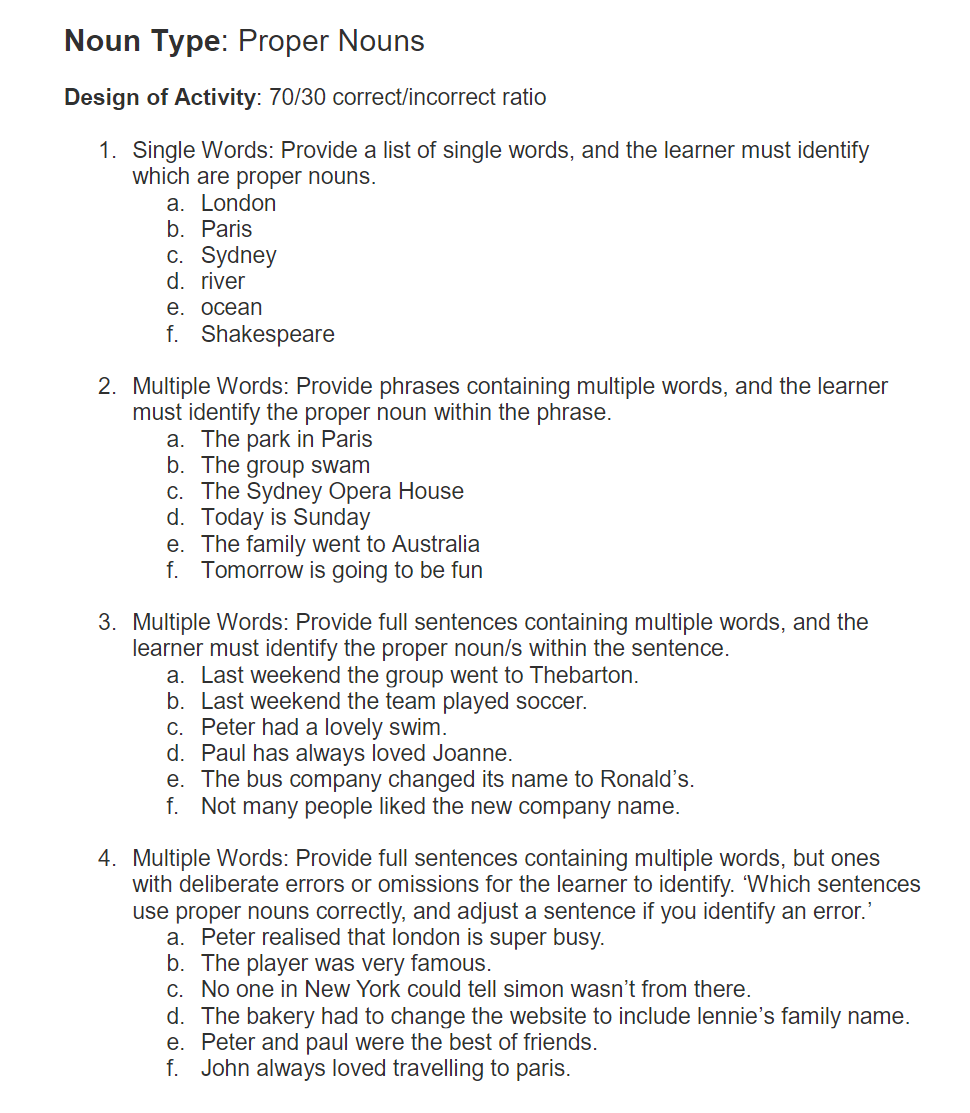 As much as possible, and especially for early-stage year levels, try not to conflate grammar components when introducing something new. For example, in the teaching of the first type of noun, proper nouns, none of the other noun types should be used. And within that teaching, to secure understanding, the complexity of the grammatical use should increase. The examples used in the ‘proper noun’ activity below demonstrate this principle which can be applied to the rest of the grammar teaching.